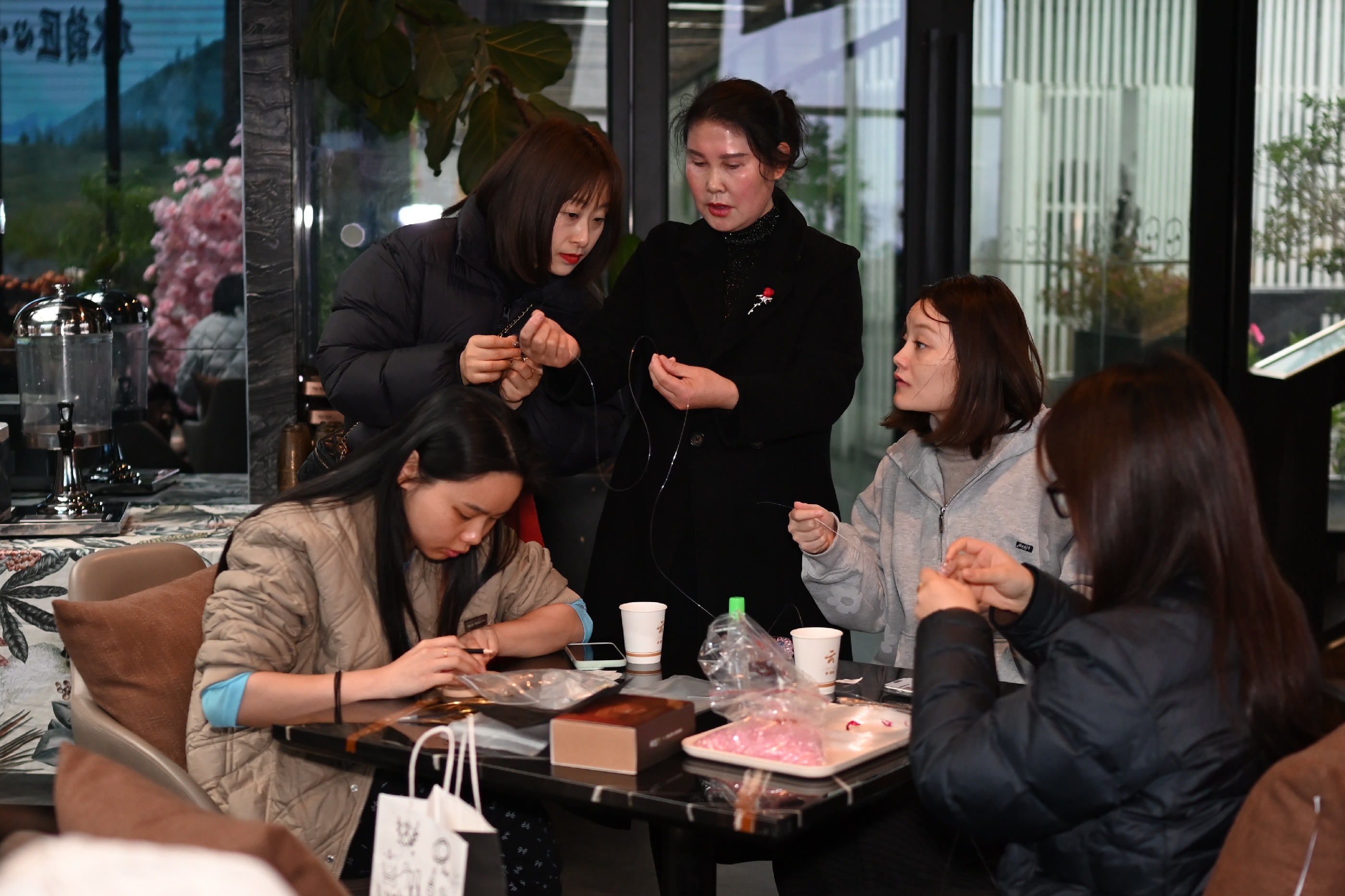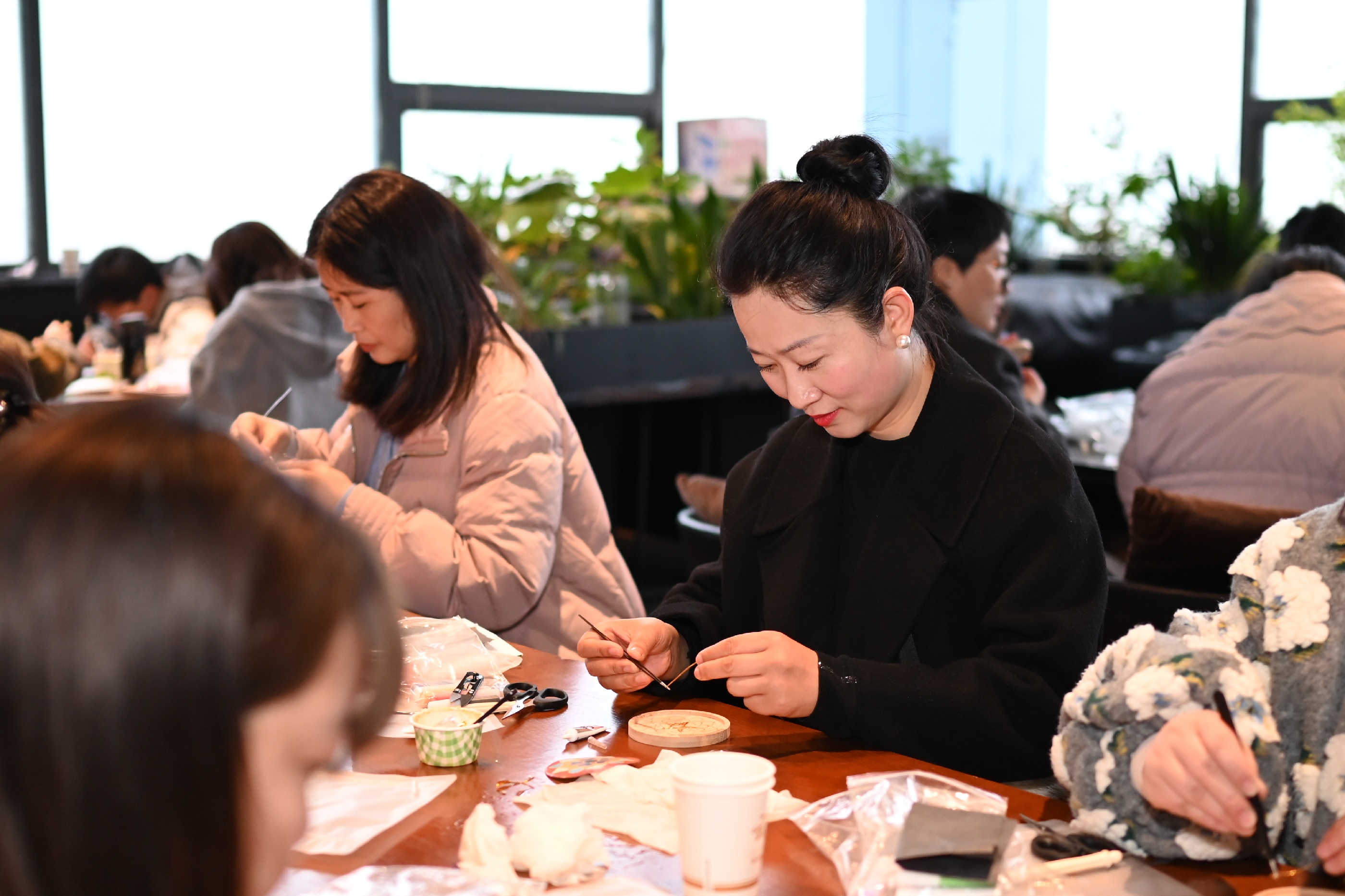 活動(dòng)伊始,兩位指導(dǎo)老師分別講解掐絲琺瑯的技法和串珠包的編織技巧。隨后,女員工們們迅速投入創(chuàng)作——掐絲琺瑯工藝區(qū),大家用鑷子將金絲彎折成型,在盤(pán)底勾勒出蓮花、游魚(yú)或水波紋,再用鏟刀將彩砂層層點(diǎn)染,金絲與釉料交相輝映,一幅幅作品逐漸呈現(xiàn)。一旁的串珠包制作區(qū)同樣熱鬧非凡,晶瑩珠串在指尖流轉(zhuǎn)穿梭,穿針引線(xiàn)、配色綰結(jié),巧思于方寸間緩緩鋪展,一只只精巧別致的串珠包悄然成型。